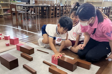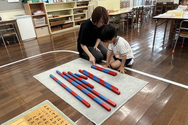 モンテッソーリ教具では、具体物をさわったり量を確認するなかで、数の世界を様々な角度からとらえていきます。